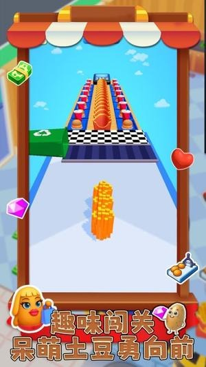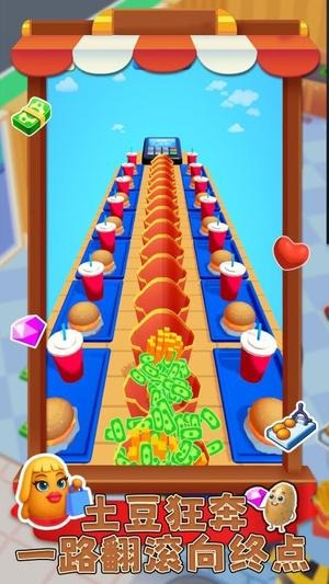 1.玩家需在跑道中精准控制土豆走向,确保其依次经过削皮、切块、烹饪等功能区完成加工。