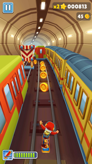 有地铁也会有隧道,中间有一根柱子,左右两边无规律会有火车奔过来,这个时候就要考验玩家的应变能力。在前期的时候过个隧道表示毫无压力,后期30W分过后经常有玩家出现手指反应不及时然后被撞死的现象。对于过隧道的技巧,眼疾手快是前提,关键是心态要放平静,这样才不会手滑。