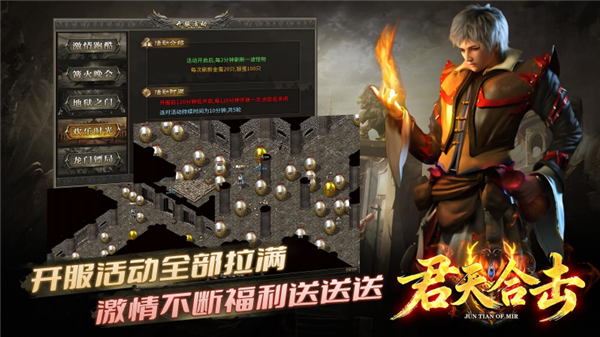 君天合击传奇是一款专注三职业合击体验的经典复刻手游。游戏基于战、法、道职业体系,构建以金币为核心的经济循环,玩家可通过打怪获取金币与合击技能书,提升合击威力,体验从押镖赚经验到全金币合成的完整成长路径。