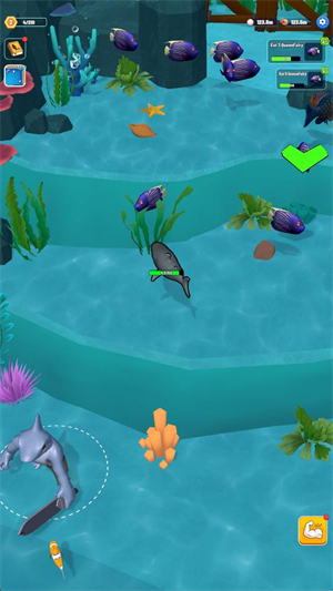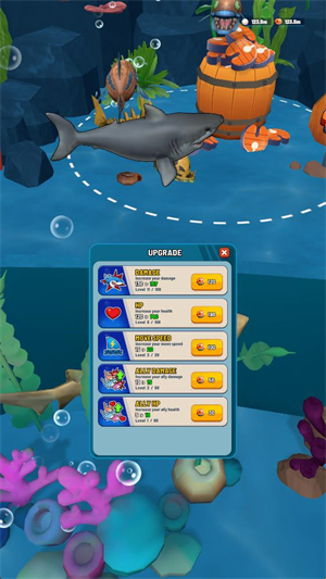 1. 进化与成长机制丰富,从一开始体型较小的鲨鱼,随着吞噬与经验积累,鲨鱼会逐渐变大变强,最终能捕食大型鱼群。