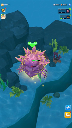 2. 吃掉小鱼后会获得材料,点击右下角的黄色按钮可以消耗这些材料来强化你的属性。