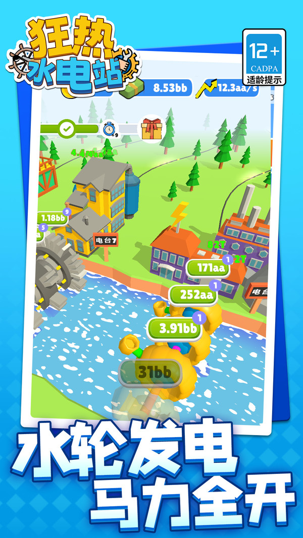 1.玩家需要通过放置和升级水车来持续产生电力和收益,逐步扩展发电规模。