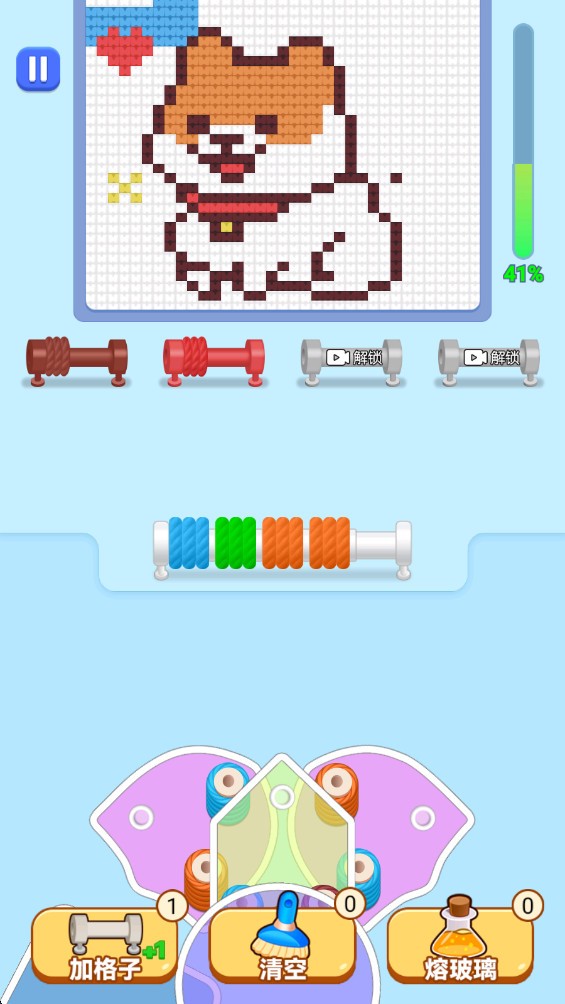 1.开始游戏后,先要选择关卡,这时你就会进入一个带有织布架的界面,查看目标图案和当前毛线的分布情况。