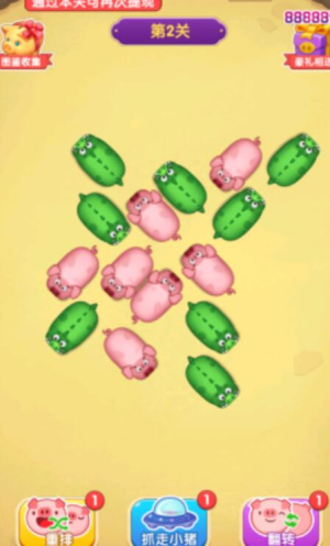 4、游戏内还设置了几种道具辅助,分别可以重新排序、直接消除一只小猪、将小猪的朝向调转。