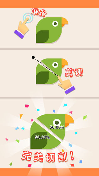 游戏玩法是非常的简单,小伙伴们可以随意发挥你的想象力,切成各种各样奇形怪状的图案都是可以的哦,无聊的时候来玩一玩还是非常不错的,快快行动吧。