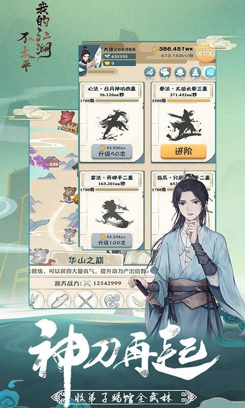 我的江湖不太平它是一款角色扮演类的游戏,游戏中有非常多的人物角色,玩家可以随时挑选自己喜欢的角色在游戏里展开一场激烈的江湖之路,还可以通过学习不同的绝世武功来提升自己的战斗力。