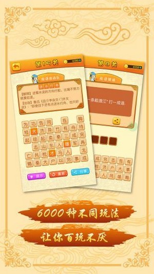 3.游戏中有非常多的关卡,每个关卡都有不同的难度,玩家要更快的激励到自己在游戏中学习到的成语,才能够轻松的通过每一个关卡。