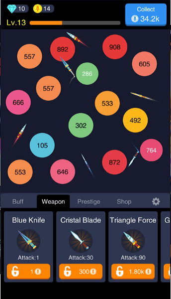 放置之刃是一款很好玩的休闲益智类游戏,在这款游戏中多种多样的关卡你都可以去挑战,每个关卡里都有很多小球,你可以去点击小球,降低这些小球的耐久度,可以通过你的飞刀,破坏这些小球,游戏完成闯关后,还能够得到大量的金币奖励。